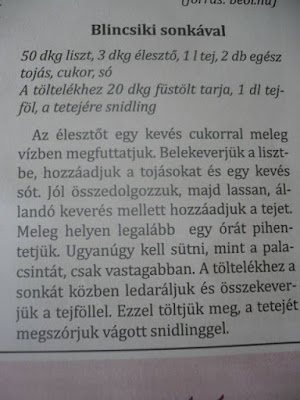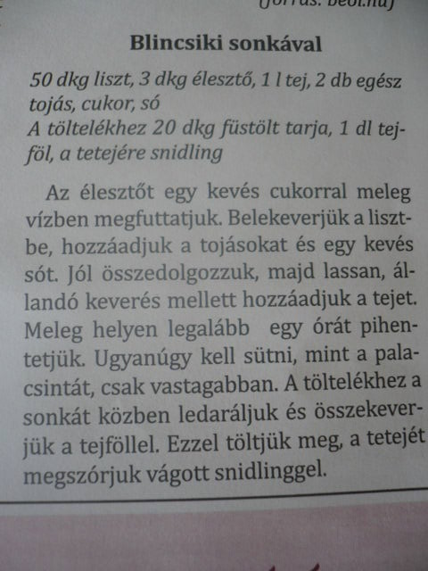 Meleg helyen legalább egy órát pihentetjük.Ugyanúgy kell sütni,mint a palacsintát,csak vastagabban.A töltelékhez a sonkát közben ledaráljuk,és összekeverjük a tejföllel.Ezzel töltjük meg,a tetejét megszórjuk vágott snidlinggel.